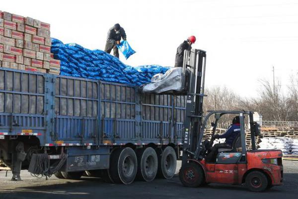 哈密市藍色火宴新能源開發有限責任公司工人在裝載銷售產品。( 記者 邢寶玉)